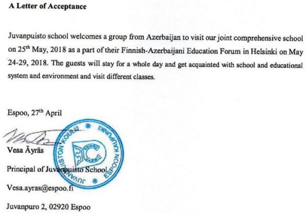 “Avropanın və dünyanın təhsildə qabaqcıl ölkələrindən biri olan Finlandiyada elm və təhsil sahəsində təcrübəmizi artırmaq məqsədilə Azərbaycandan bir qrup təhsil işçiləri, məktəb direktorları və müəllim heyəti ilə birlikdə Finlandiyanın paytaxtı Helsinkiyə səfər etməyi planlaşdırırdıq. 24-29 may 2018-ci il tarixində Helsinkidə “Finlandiya-Azərbaycan Elm və Təhsil Forumu” adlı elmi-təcrübə proqramı həyata keçirməyi qərarlaşdırdıq. Bu səfərin əsas məqsədi dünyada elm və təhsildə keyfiyyət deyildiyində ilk ağıla gələn Avropa ölkələrindən birinin təcrübəsini öyrənməkdən, həmçinin Avropa ilə Azərbaycan arasında mədəni və elmi münasibətlərin inteqrasiyasına kömək etməkdən ibarət idi”.